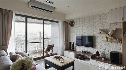现代简约风格的特色是将设计的元素、色彩、照明、原材料简化到最少的程度,但对色彩、材料的质感要求很高。上图的电视背景墙非常简单,只用了文化石这种装修材料砌出一面墙做电视背景墙,大量的留白让空间显得干净简洁,白色的电视柜、白色的文化石墙与黑色的电视、黑色的壁灯相呼应,在家居设计上以简洁的造型、完美的细节,营造出时尚前卫的感觉,具有舒适与美观并存。
