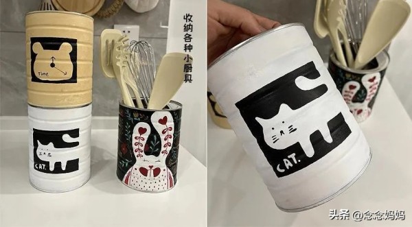 厨房里用的勺子,铲子,打蛋器等,如果直接放在厨房非常占地方,看起来还杂乱无章。可以把厨房里的厨具归纳到奶粉罐里,既方便又省了空间,一举两得!