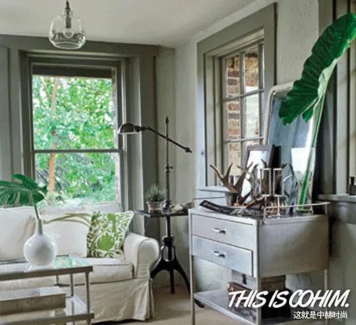 中性色调的家居空间同样非常适合用巨大绿叶来装点,这样显得更俏皮,把原本稍显呆板的环境生活化。在老式医用车顶上放置的象耳叶,能使人幻想植物学实验室等,极具趣味感和设计参考价值。