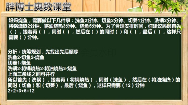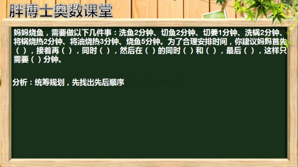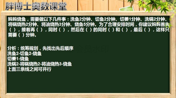 今天分享的题目如下:妈妈烧鱼,需要做以下几件事:洗鱼2分钟、切鱼2分钟、切姜1分钟、洗锅2分钟、将锅烧热2分钟、将油烧热3分钟、烧鱼5分钟。为了合理安排时间,你建议妈妈首先(),接着再(),同时(),然后在()的同时()和(),最后(),这样只需要()分钟。