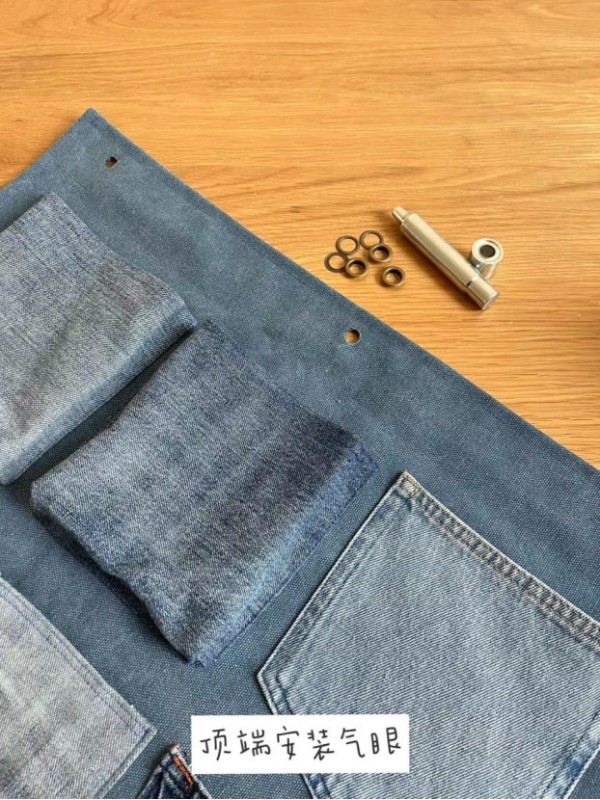 旧牛仔裤、剪刀、针线、气眼扣、敲气眼工具