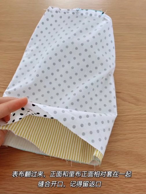 第五步:表布翻过来,正面和里布正面相对套在一起缝合开口,记得留返口