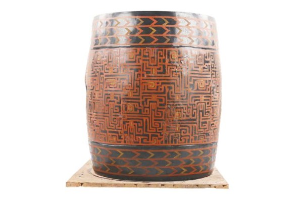 修复后的建鼓,鼓身髹黑色底漆,通体施红色变形窃曲纹,面覆牛皮,完整精致。