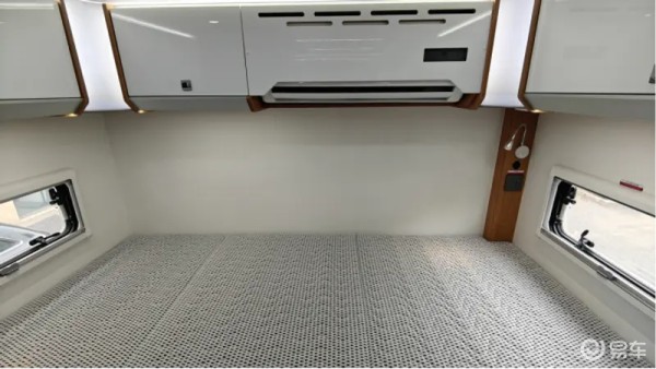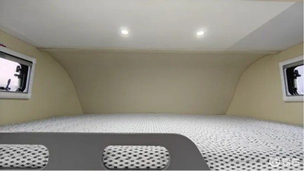 车内设有两大睡卧区:驾驶室顶部额头床尺寸为2.2×1.5米,轻松容纳两名成年人,两侧对向外推窗增强采光通风性,额头日行灯满足夜间照明需求;车厢后方横置双人床尺寸为2.2×1.3米,上方配备1.5P一级能效家用变频空调,右侧安装床头阅读灯与220V插座,上方环绕式储物柜满足日常用品收纳需求。
