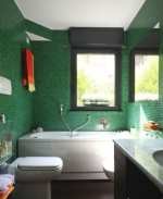 绿色铺贴的马赛克墙面搭配白色洁具让卫浴间看上去清新又充满活力。