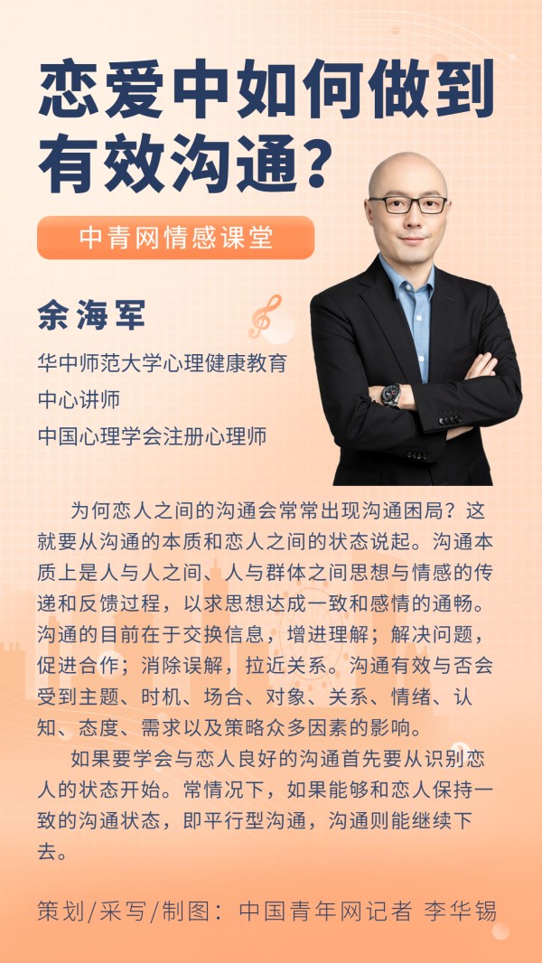 中国青年网北京11月24日电(记者 李华锡)在现实生活中,感情都需要用沟通交流来维系,特别是在恋爱关系中,做好沟通可以使恋爱更加稳定和长久,从而让亲密关系更加稳定。那么,什么是有效沟通?恋爱中如何做到有效沟通?有哪些具体的方法?中国青年网记者专访了华中师范大学大学生心理健康教育中心讲师、中国心理学会注册心理师余海军。