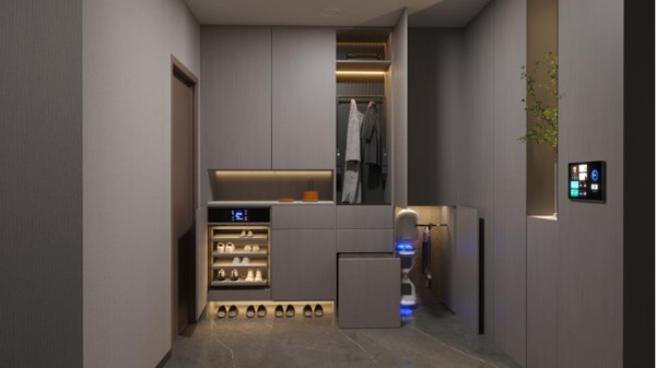 在睿住智能的智能空间玄关场景方案中,将安全消杀、无接触式的感应酒精手部消毒、扫拖一体机器人融合在入户场景内,并且充分考虑美观度,将智能设备产品隐藏、融合在智能柜体内。