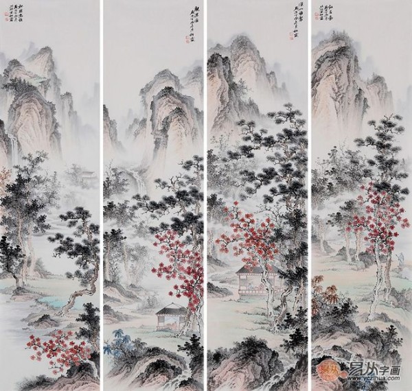这是一幅意境极深的四条屏画作,四条屏是中国画独特的艺术表达形式,屏中的每一幅画面都有着自己独立的雅致韵味,四幅组合又呈现出一个统一的主题,洋洋大观,表达的意境更加丰富。这幅作品构图严谨巧妙,画面明净雅逸,四个画面看似相同,其实则不同,各有千秋,利用相同的背景展现了不同的景色,并且其中各有故事性,却又有着统一的意境美,青山隐隐,白雾茫茫,草木丛生,在这清幽的环境中,点景人或饮茶赏景,或拄杖访友,或与友人畅谈,皆有浓郁的诗意感,高古、苍润、旷远,构建出一方栖息心灵的家园!这样一幅意境深远,品位极深的作品挂在书房之中,不仅显得您大气,也彰显了您品位的高雅,同时更是能够直线拉升书房装饰的品位!从而营造出一个完美的书房环境氛围,对我们的学习和思考也会是有着辅助作用!
