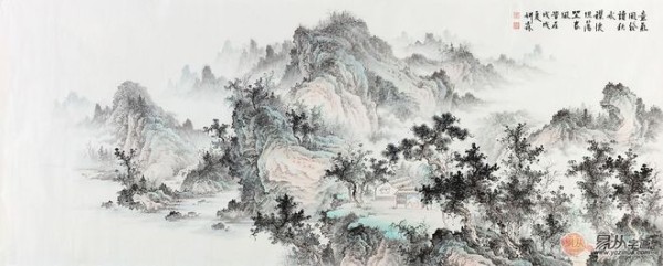 李佩锦老师八尺横幅水墨山水国画,采用俯视的视角描绘了开阔的自然景色之美,用笔细致老辣,绘画功力深厚,整幅画空间层次感极强,有着极深的代入感!画中山峰众多层峦耸翠十分奇特,山石上又有茂密的水墨植被生长,生机勃勃十分茂盛,而山石线条流畅排列更加的细致!山间云雾缭绕,多采用留白法和哄然法描绘展现,烟云缭绕意境深远,宛如人间仙境一般;左侧的湖泊是描绘河岸山石之后的留白,描绘细致宁静非凡!山间平台上几间房屋坐落,名士屋内饮酒赏景,展现了逍遥而怡然自得的情怀!,远处山峰连绵高耸而陡峭,线条密布皴擦细致,淡墨描绘山峰和渲染的云雾相和,既展现了绘画技巧的高超,又有意境深远景色雅致!整幅画以水墨为主,描绘了淡雅艺术的山水景色,让人心静,经典水墨艺术国画!这样淡雅清幽的画作是非常有品位的象征,挂在书房定是可以渲染出浓重的艺术气息。