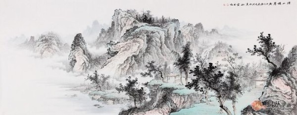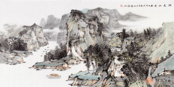 沙发背景墙挂画 李佩锦四尺横幅国画《湖光山色》作品来源:易从网