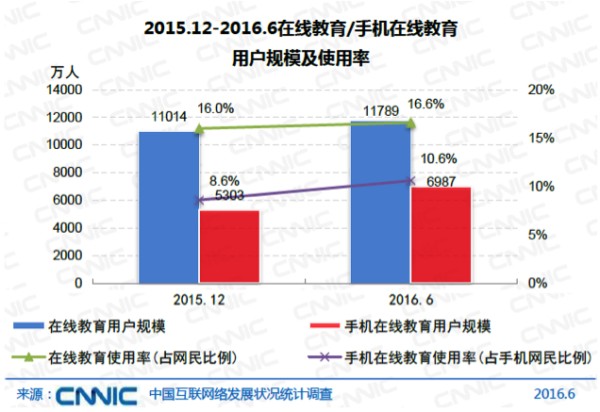 8月初,中国互联网络信息中心(CNNIC)在国家网信办新闻发布厅发布了第38次《中国互联网络发展状况统计报告》,报告数据显示,截止2016年6月,我国网民规模达7.10亿,在线教育用户规模达 1.18 亿,较2015年底增长7.0%。其中,手机在线教育用户在近半年涨势凶猛,已达到6987 万,与 2015年底相比增长率为 31.8%,首次超过PC在线教育用户,占整体网民的比例也从去年的从8.6%上涨到10.6%,移动教育时代已然来临。