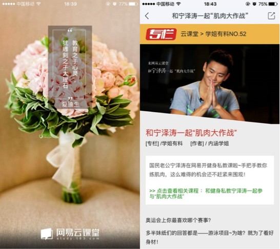第三,为学习增加趣味性。相对PC端学习的严肃性,App学习更加轻量级,而通过运营活动、产品设计等方式,能让用户在轻松活泼的环境中学习,减少枯燥感。比如网易云课堂App的开机屏,会根据时节变化,推荐名人名言,并配上精美的背景图,赏心悦目。此外,在App首页焦点图的下方,网易云课堂还安排了大量与时事热点结合的轻资讯内容,通过活泼有趣的文章,或者推荐优质课程,或者介绍一些生活小常识,寓教于乐,深受用户喜爱。