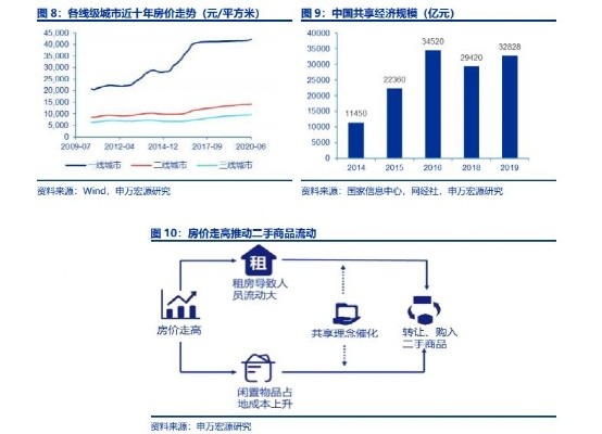 研报指出,高线城市房价的持续走高使得闲置物品占用空间的代价不断上升。高房价同时也使得租房率不断上升,根据《租房消费行为调查报告》,一线和部分新一线城市租赁人群的比例或超 40%,人员流动性较大,租客更多选择二手平台购买或出售室内用品等。