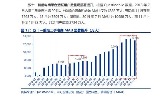 2019 年 7 月,闲鱼、转转合计 MAU 为 10688 万人,当年11 月上升至 13422 万人,月活用户增加 2734 万人。