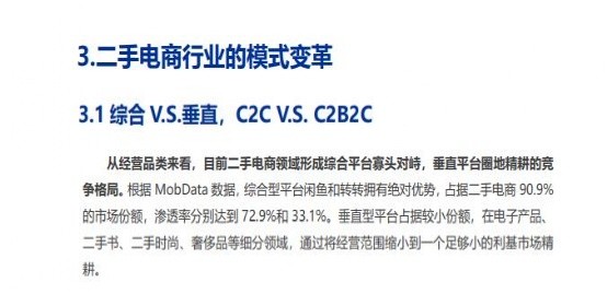 研报分析认为,从当前趋势看,头部企业的集中度会愈发提升,闲鱼、转转这两家综合型二手电商平台的优势将更加凸显。
