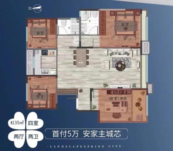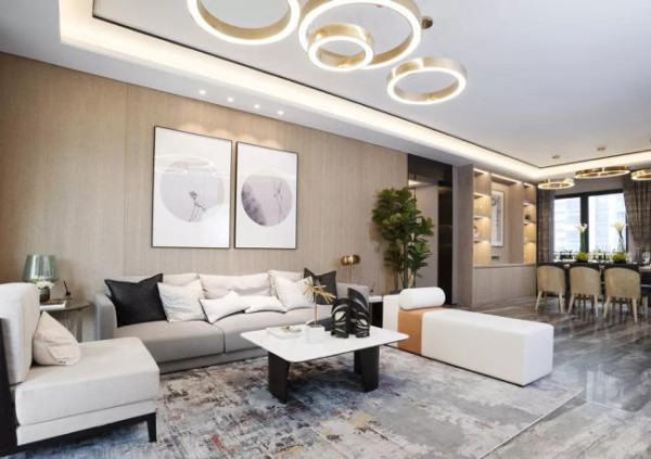 建面约135㎡奢适华宅,精筑黄金四角空间布局,将有限的空间科学排布,消融了室内的过道空间,极大程度缩短家居生活动线,提高了空间利用率。