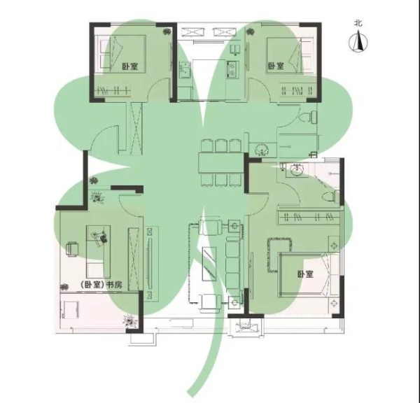 出于对家庭成员之间不同生活方式的考量,建面约135㎡四室两厅两卫,整个户型像一颗“四叶草”。