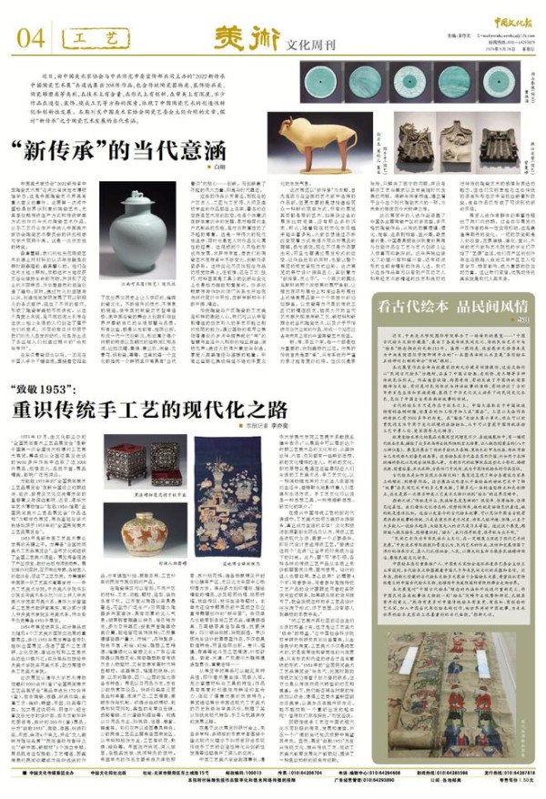 “把工艺美术再拉回到活生生的生活的根基上去,这才是让工艺美术‘续命’的根基。”在中国社会科学院哲学研究所研究员刘悦笛看来,从生活美学的角度,工艺美术不仅是纯艺术的,它是实用性和审美性的内在贯通,只有形式和内涵的结合才是有意味的形式。“1953年的‘全国民间美术工艺品展览会’与古代、民国时期的传统之间仍有着千丝万缕的联系,但它也是从传统向现代转型的初见和奠基。当下,我们能否将各时期的传统加以统合,使得工艺美术重新回到生活美学,以美生活去提升好生活,能不能找到一个重新出发的起点呢?值得我们思考探究。”刘悦笛说。