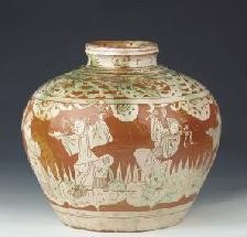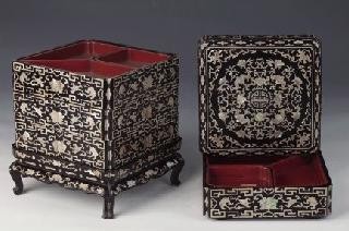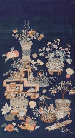 ▲ 左图为蓝地博古缂丝镜芯,右上为黑漆螺钿莲花拐子纹节盒,右下为彩陶人物图罐。