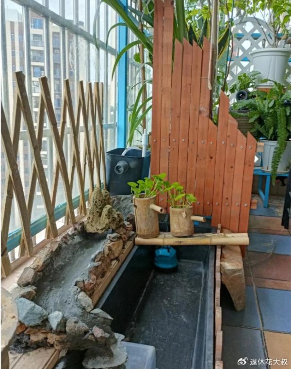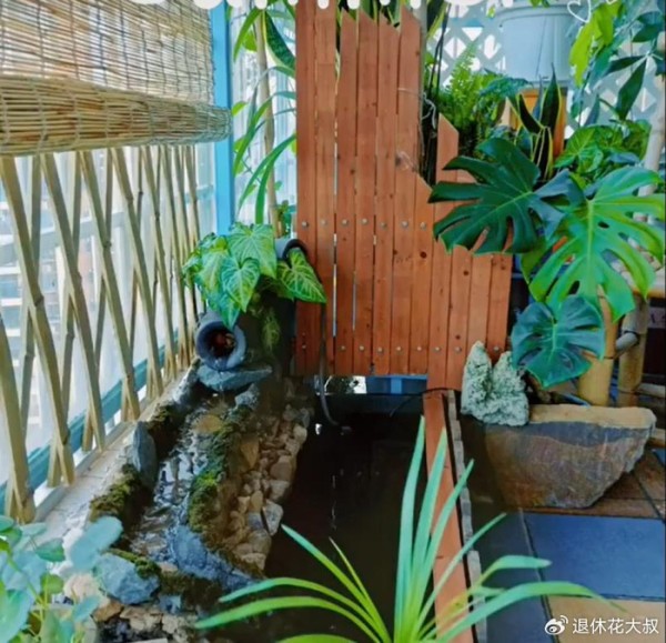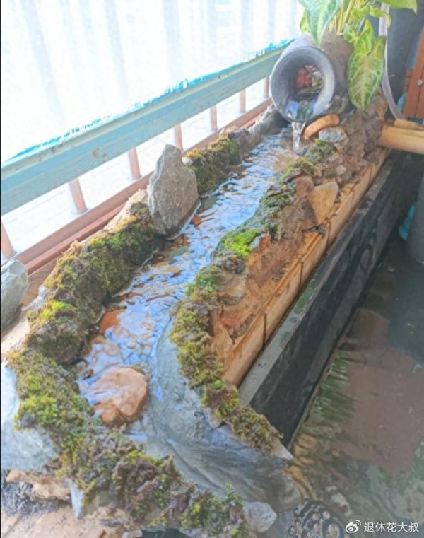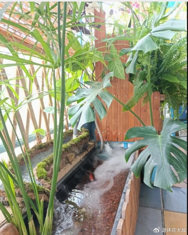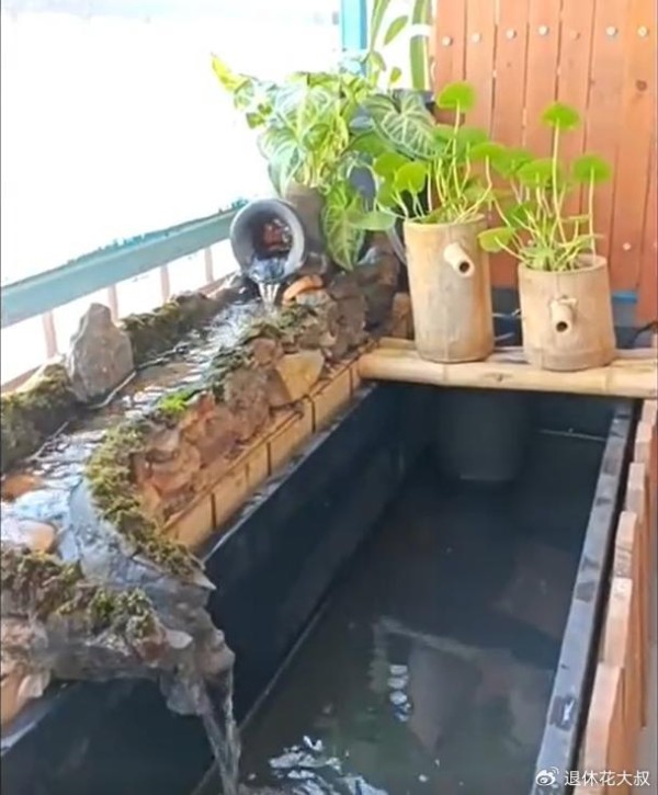 她竟然亲自动手,在室内不大的阳台上,打造了一个不大的“溪流景观”,听溪、观鱼、喝茶,简直不要太惬意。