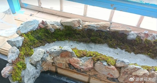 根据自己需要的造型,上面铺上事先准备好的石头,将有空隙的地方用水泥抹平,这样就得到了一个溪流景观的毛坯半成品。