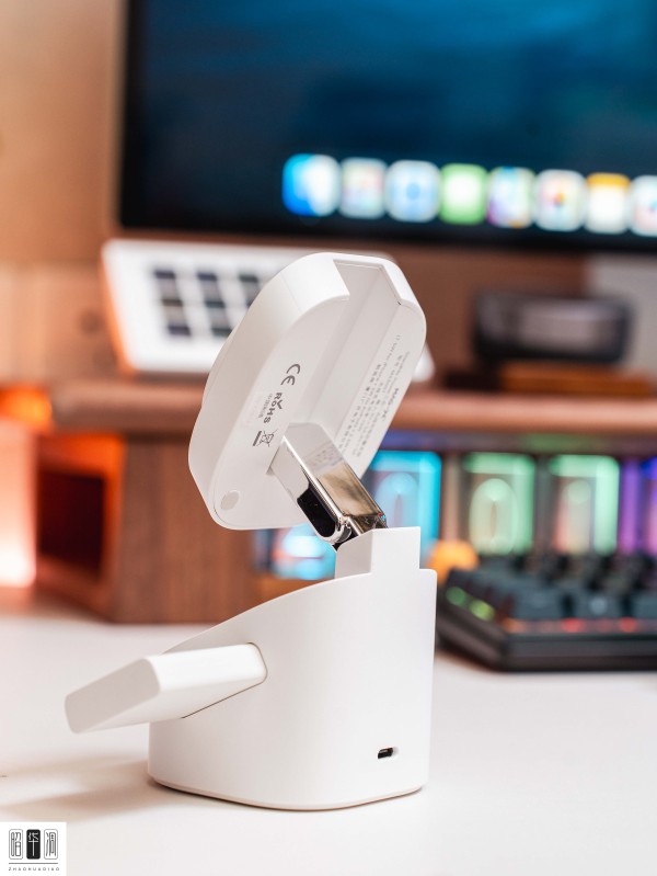 iWALK无线充的造型相当简洁,无线紧凑设计不仅提升了产品的外观美感,还显著减少了对桌面空间的占用,有效避免了传统充电器和数据线所带来的杂乱无章。纯白色的机体设计,配合自由调整的倾斜角度,随手一放都是满满的科技感。