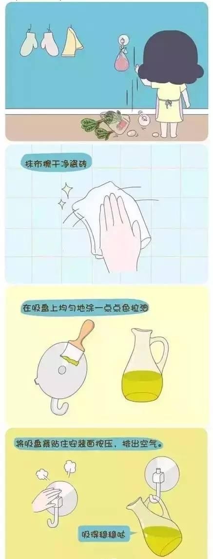 不得不说,你是不是也有过挂着东西的挂钩突然间松掉的经历呢?挂了又换,换了一个接一个!好浪费!其实,只要先用抹布搽干净瓷砖,在吸盘上均匀地涂上一点点油,将吸盘紧贴住墙上按压,排出空气!吸得稳稳哒~