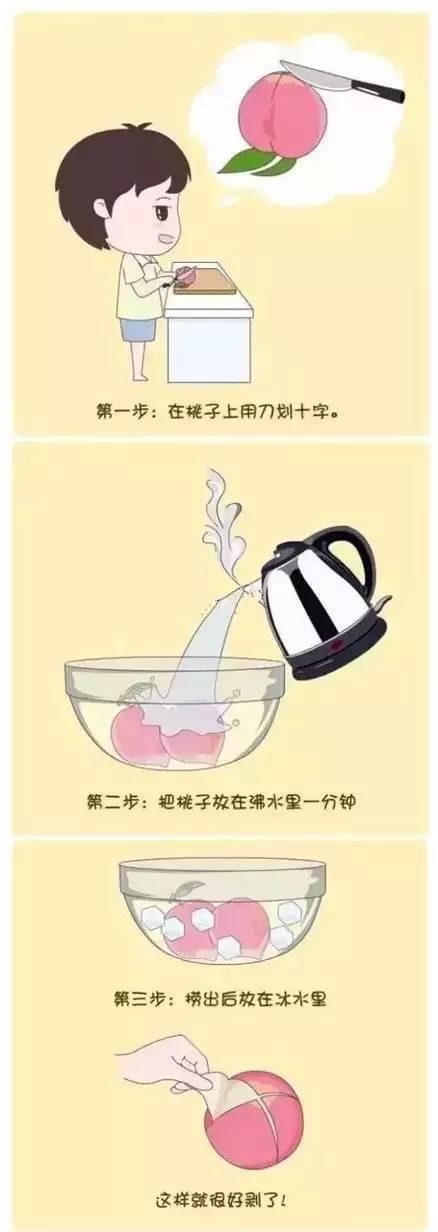 水蜜桃的皮毛茸茸的,很难削。NO!在桃子上刮一个十字,放沸水里泡一分钟,再放冷水里,轻易就能把皮剥了。