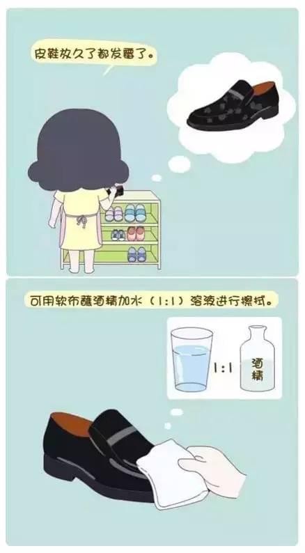 放久的皮鞋发霉了?用酒精加水,要1:1的量,然后用布沾点来擦就可以了。