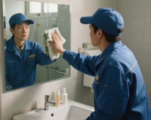 接下来,清洁洗手台和镜子。使用适合的清洁剂喷洒在洗手台和镜子表面,然后用抹布或纸巾擦拭。对于镜子,要确保没有水印和污渍,保持光亮如新。在洗手台周围的区域,也要特别注意清理下水道口及侧面的污垢。此外,可以顺便检查水龙头是否有漏水现象,确保其正常工作。六、地面拖洗和消毒