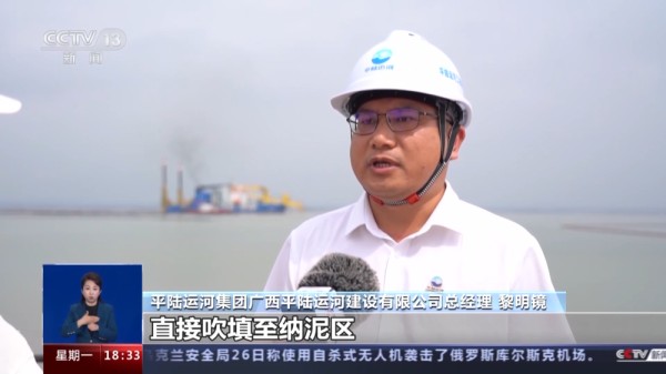 平陆运河集团广西平陆运河建设有限公司总经理 黎明镜:它主要负责约5公里河段开挖,总开挖量约200万立方米。通过绞吸挖泥的方式,将疏浚的土石方经过排泥管直接吹填至纳泥区,根据平陆运河地质情况资料显示,我们绞吸船日均吹填的土石方量可达2.5万立方米,完成普通疏浚船舶无法完成的快速挖岩任务。
