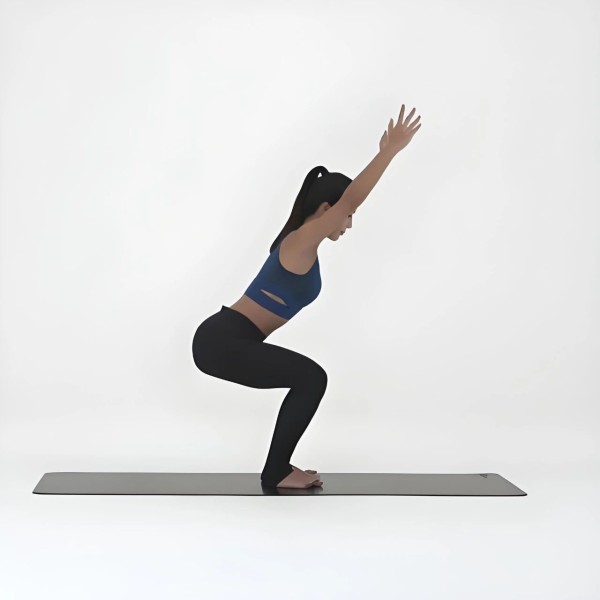 这个动作能激活你的全身,特别是下半身。站直,脚分开,脚尖外展,手臂上举,然后蹲下来,膝盖外展。