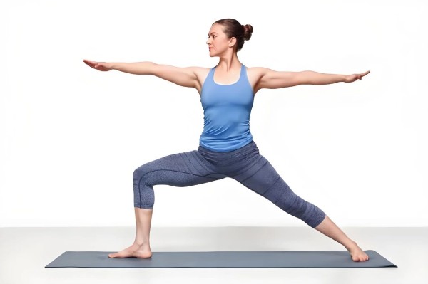 这个动作就像一个战士一样,两腿分开,一脚前一脚后,前腿弯曲成90度,手臂打开,目光看向前方。