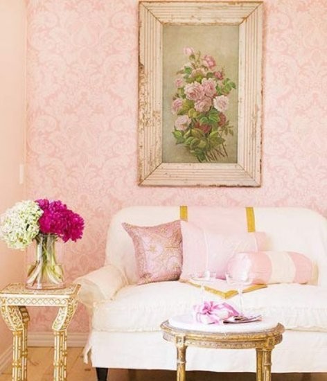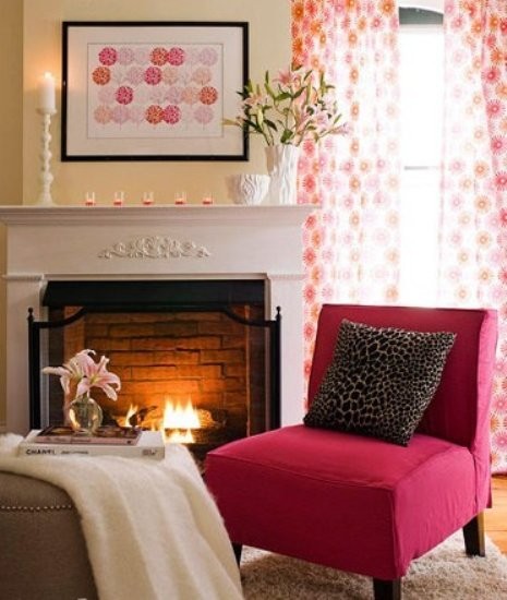 被处理成米色的墙面,搭配上具有明显春意的玫瑰色和花朵图案,让人犹如置身缤纷花园,恬淡而美好。同色系的窗帘和靠垫在律动中统一协调,淡彩轻快的色彩搭配让整个居室显现出一派田园乡村风情。