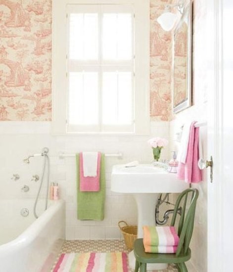 卫浴间采用了拼接式的墙面打造手法,对割裂的空间起到更好地修饰效果。大型的花朵图案是墙面的主角,成为卫浴间里最醒目的地方,而粉色系为卫浴间增加了女性的柔美,零星的绿色点缀让卫浴间充满了活力。