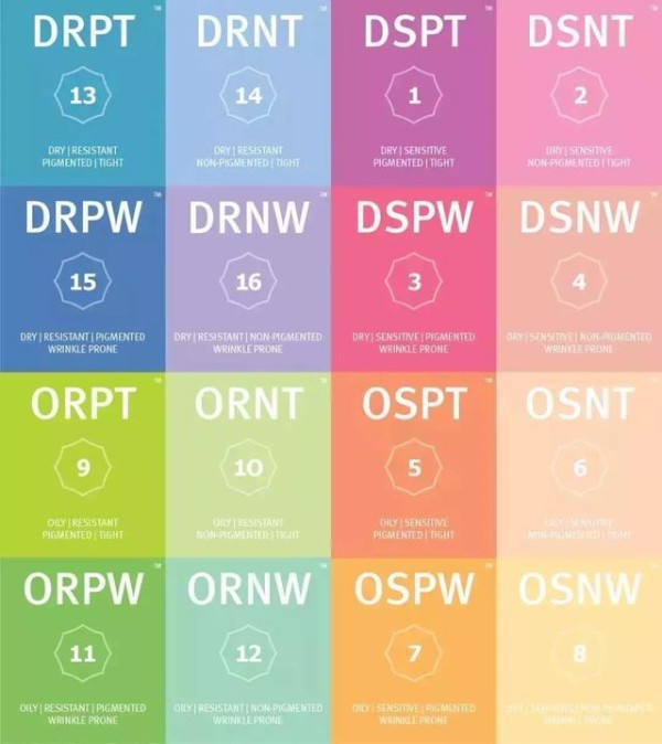 排列组合,就产生了十六种不同的皮肤特性,比如OSPT「油性、敏感、色沉、紧致」或者DRNW「干性、耐受、非色沉、皱纹」。