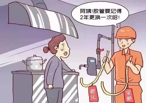 家用燃气胶管要勤检查,出现老化、龟裂、起泡或破损,必须更换不锈钢波纹管,波纹管两端必须上紧牢固,防止脱落。燃气具的使用寿命是8年,如果超过使用年限,就得赶紧换了,别心疼钱,安全才是最重要的。