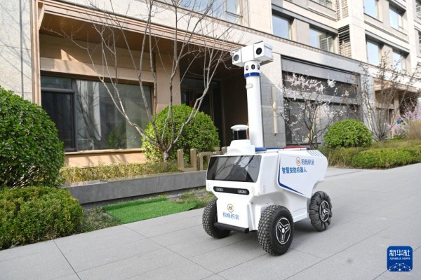 智慧安防机器人在雄安新区华清园小区巡查(3月25日摄)。该机器人具备全天候自动巡逻、环境监测、人体检测、车牌识别、烟火识别等功能,能够完成部分夜间值守、重点区域巡查等工作,提升社区安全感和治理效率。