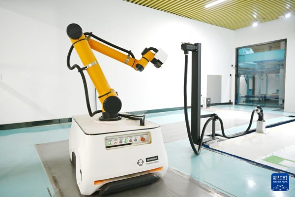 这是雄安新区剧村变电站智慧充电区的电动汽车充电机器人(3月25日摄)。