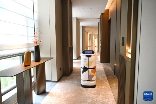 在雄安新区容东片区一家酒店,外卖机器人为住店客人送外卖(3月26日摄)。