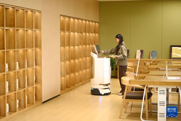 市民在雄安图书馆体验智能送书机器人(3月25日摄)。作为雄安新区首个城市级公共文化地标,雄安图书馆以智能化服务,为读者提供便捷阅读的新场景。