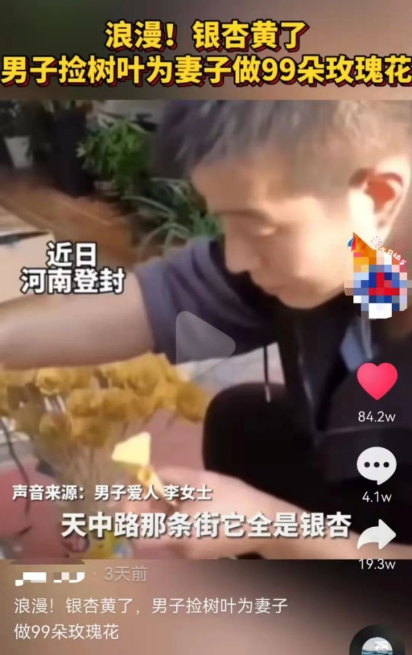 就在前两天,河南登封一名丈夫用秋天的银杏叶为妻子做了99朵玫瑰花,在很多平台火了。