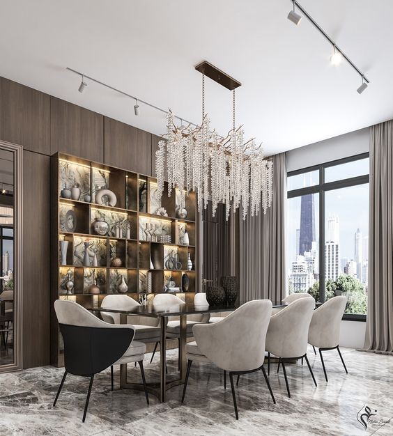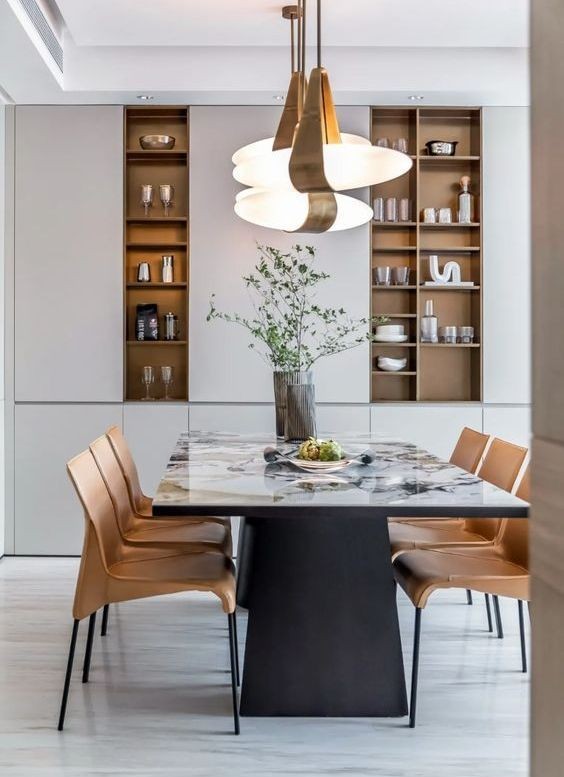 餐厅里的基本照明光源最佳选择是照亮餐桌区域的吊灯,此外可以有一两盏调节气氛的壁灯或者烛台。餐厅区域的照明尽量避免直射灯光,这个区域应该有的气氛是如食物般温馨放松的。