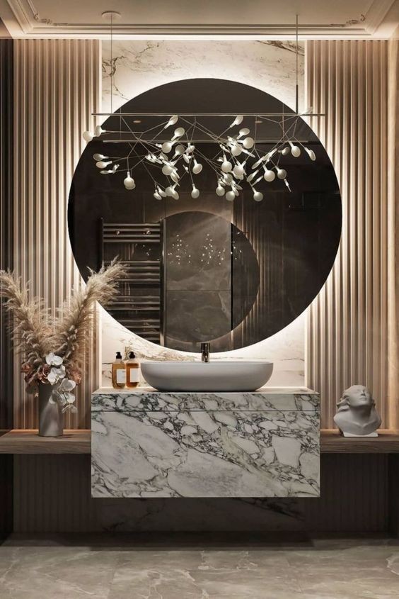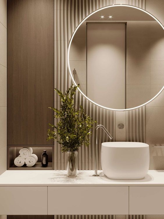 卫生间的光源也有功能性要求——负责照亮梳妆镜,可以选择暖光源让你夜间进入厕所时不至于因为太亮而中断睡意,也可以让你能在柔和光源下看自己的脸,不至于被自己脸上的日渐增大的毛孔吓着。