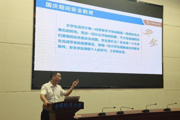 在国庆节假期即将来临之际,李四光学院常务副院长单华生为全体新生举办了一场安全教育讲座。会上,单院长以严谨的态度,强调了生命安全的重要性,并提醒学生们务必重视个人安全防护。他具体阐述了火灾、溺水、交通伤害等潜在危险的防范措施,并详细指导了学生在面对这些危险时应当采取的应急措施和逃生技巧,以确保能够在紧急情况下迅速、有效地保护自身安全。