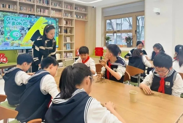 活动中,来自朝实福源分校的学生们率先体验了“变废为宝”的奇妙旅程。在社区美学馆内,孩子们不仅聆听了一片茶叶从采摘到成为茶渣的“生命故事”,更亲手将收集来的茶渣制作成天然的香薰制品。通过揉捏与创造,孩子们在实践中深刻感受到了资源循环再生的魅力与环保行动的温度。