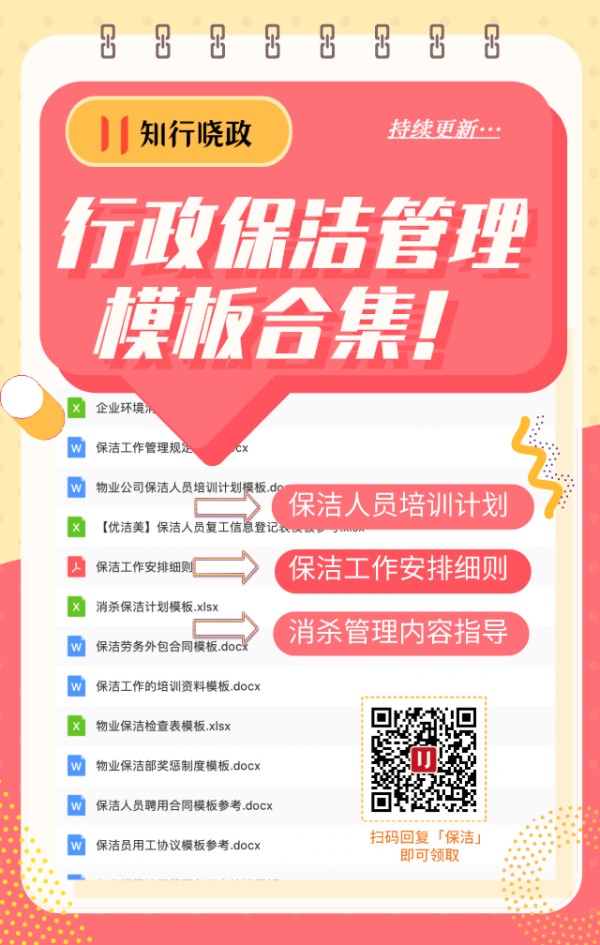 为了让保洁管理的每个细项变成可视化的内容记录,全面做好保洁管理工作,给员工们提供全方位的防护,小知已经将文中所涉及到的「保洁管理制度模板」全部整理好啦!