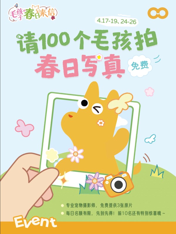 用镜头定格毛孩子的灵动瞬间,把春日的软萌美好永久珍藏!“100只毛孩免费春日写真”拍摄活动,无需花费,就能给家里的萌宠拍一套氛围感满满的春日写真照,让毛孩子化身小小模特,在春光里留下专属的可爱影像。