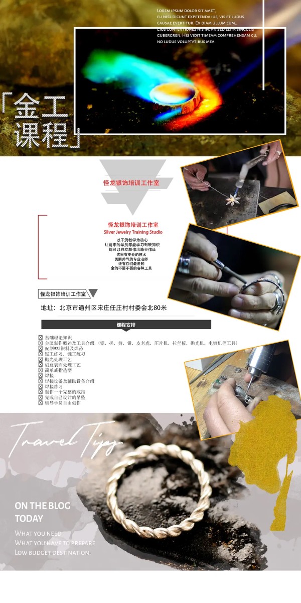 二、学习目标: 使学员全面了解手工银饰工艺制作流程,掌握各种手工银饰传统制作工艺及现代加工技术,让学员从零基础开始达到能够独立创作各类手工银饰作品。 三、精品小班原创课程: 金工基础工艺(第1-2天:七天和十天课程学员均学习): 1、手工银饰工艺概述、各类工具设备及材料性能讲解、安全规范操作知识 2、熔银、压片、压条、拉丝、锯形、焊接、锉整、打磨、抛光等制作工艺的针对性学习 3、金工基础工艺成品呈现 金工进阶工艺(第3-5天:七天和十天课程学员均学习): 1、宝玉石、珍珠等的镶嵌 2、金属表面处理工艺(镜面抛光、仿古做旧、亚光磨砂、锻打肌理等)