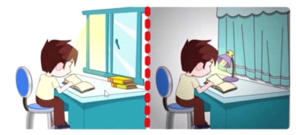 晚上看书写字时,要同时使用书桌台灯和房间顶灯,并正确放置台灯。